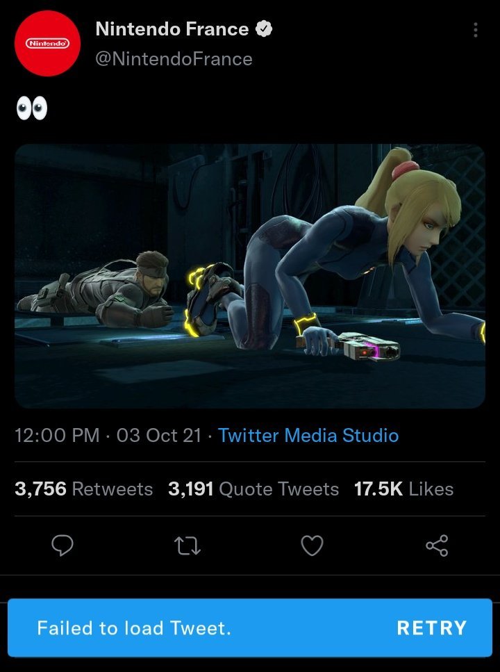 L’account Twitter ufficiale di Nintendo France ha cancellato uno dei suoi ultimi tweet, i quali protagonisti sono Samus Aran direttamente dalla saga di Metroid e Snake da Metal Gear Solid all’interno di Super Smash Bros. Ultimate!