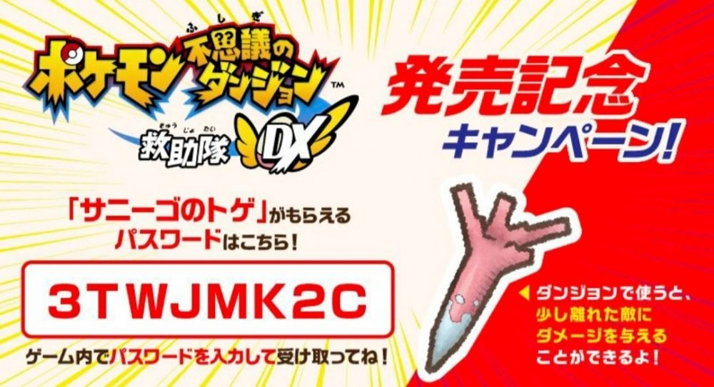 Come in ogni gioco di avventura che si rispetti in questi dungeon troveremo tesori e strumenti di ogni genere, che ci permetteranno di potenziare la squadra o guadagnare monete di gioco. Nel titolo è però presente la possibilità di utilizzare delle password per ottenere particolari contenuti nel gioco, da missioni a strumenti. The Pokémon Company ha da poco comunicato una nuovissima password. Con essa potrete ottenere lo strumento Spinacorsola nella vostra partita di Pokémon Mistery Dungeon: Squadra di Soccorso DX. Questo appuntito proiettile potrà essere lanciato contro i nemici a distanza per effettuare parecchio danno. Nel gioco è presente anche uno strumento equivalente, ma regalato da Cacnea, la Spinacacnea per l’appunto. La Password per ottenere la Spinacorsola è: 3TWJMK2C.