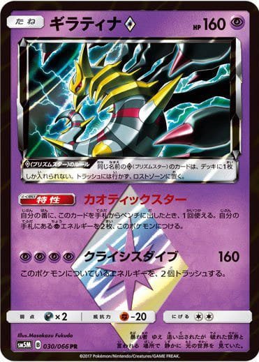 La carta di Giratina sarà di tipo Psiche, avrà 160 Punti Salute ed è un Pokémon Base. Possederà l’Abilità Chaotic Star: quando questo Pokémon sarà giocato dalla tua mano sulla tua Panchina, puoi attaccare 2 carte Energia dalla tua mano a questo Pokémon. Inoltre avrà come unica mossa Crisis Dive che infligge 160 Punti Danno, ma costretti a scartare due Energie a questo Pokémon.