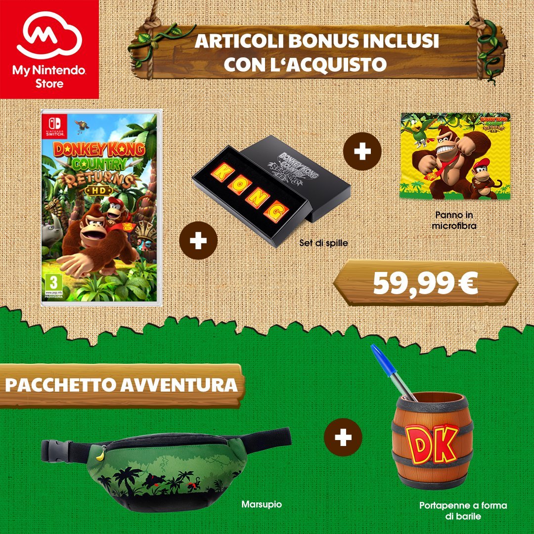 Oltre all’iconico set di spille e il panno in microfibra già inclusi nel preordine del gioco per il classico prezzo di 59,99€, si potrà decidere di spendere ulteriori 7€ per ricevere anche un simpaticissimo portapenne dalle sembianze dello storico barile di Donkey Kong e un marsupio raffigurante la scimmiesca famiglia muoversi orizzontalmente in un ambiente selvaggio. Proprio a richiamare la grafica a scorrimento a due dimensioni del gioco!