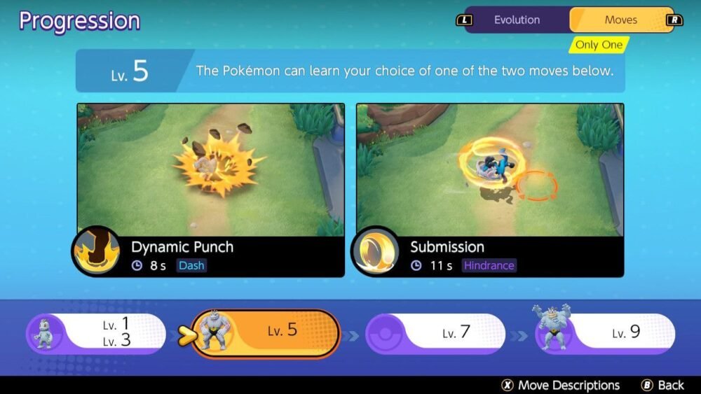 - Submission: La velocità di movimento del Pokémon aumenta e non può essere confuso. Aumentano anche i danni del prossimo attacco base e respinge i Pokémon avversari impedendogli di muoversi. Cresce anche la possibilità di infliggere colpi critici e velocizza gli attacchi base per un breve periodo, questa mossa può essere appresa al Livello 7, si ricarica in 11 secondi e rientra nella categoria Hindrance.