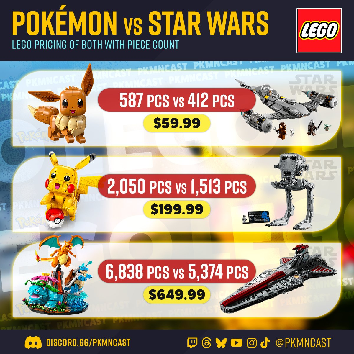 Pikachu avrà 2050 pezzi, per lo stesso prezzo troviamo Walker AT-ST™, che ha 1513 pezzi, esattamente 537 pezzi in meno alla mascotte Pokémon per eccellenza.