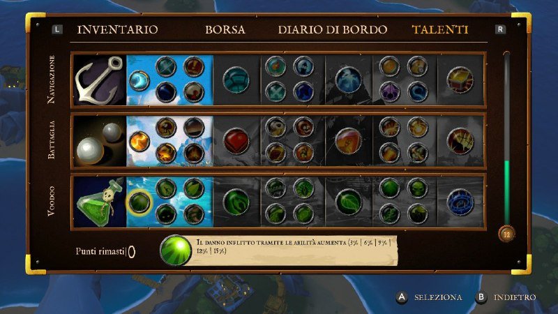 Nell’albero delle abilità, qui chiamato Talenti, avremo a disposizione dei punti (che si guadagnareanno all’aumento di ogni livello) da spendere in tre differenti categorie, ognuna con le proprie caratteristiche e migliorie: Navigazione, Battaglia e Voodoo.