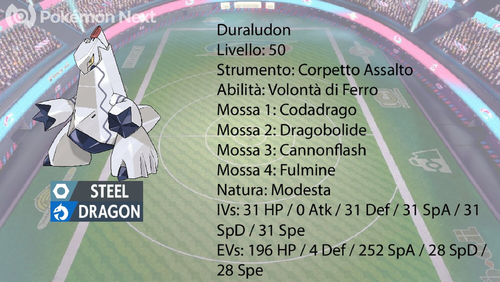 Il terzo Pokémon da analizzare è Duraludon. Scelto per la sua capacità di ignorare i Redirector con la sua HA Volontà di Ferro, questo Pokémon risulta essere molto utile contro PZ. Possiede le mosse Dragobolide, Cannonflash, Codadrago, utile per allontanare dal campo i TR Setter che vogliono piazzare Distortozona, e Fulmine, mossa utile per riuscire a contrastare i Pokémon di tipo Acqua. La Spread EV, unita all’effetto dello strumento Corpetto Assalto, gli permette di reggere i vari colpi di PZ e di fare molti danni.