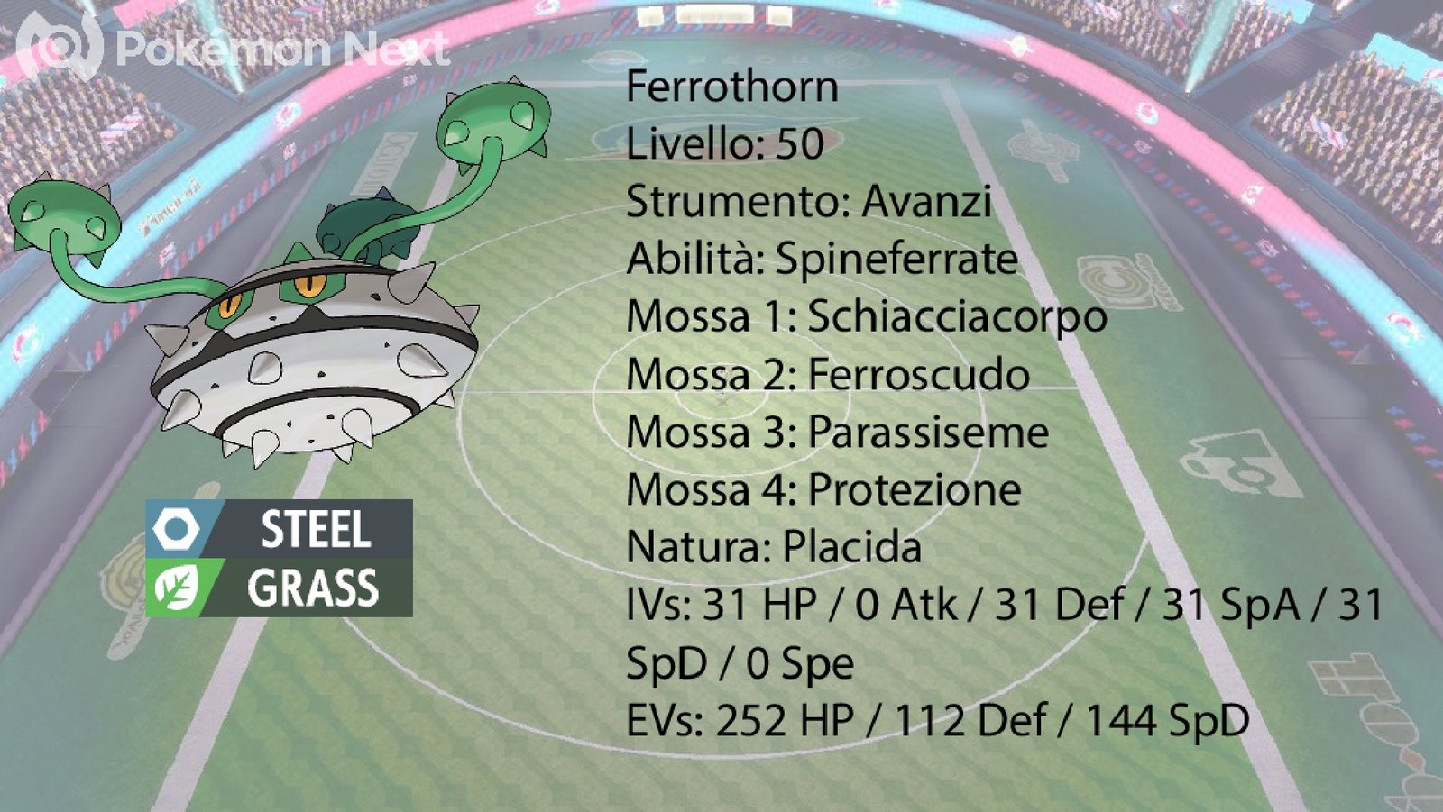 Il quarto Pokémon da analizzare è Ferrothorn. Come detto in precedenza, questo Pokémon può risultare molto utile verso gli ultimi turni di gioco, in particolare quando l’avversario non possiede Pokémon di tipo Fuoco o Urshifu, che sono pericolosi per Ferrothorn. Le mosse che possiede sono Parassiseme, mossa utile per guadagnare PS togliendoli agli avversari, Ferroscudo, utile per aumentarsi la Difesa di 2 stadi, Schiacciacorpo, mossa che infligge danno in base alla Statistica di Difesa dell’utilizzatore, e Protezione. La Spread EV massimizza il potenziale difensivo del Pokémon. Unita all’effetto dello strumento Avanzi, Ferrothorn si può rivelare un enorme pericolo.