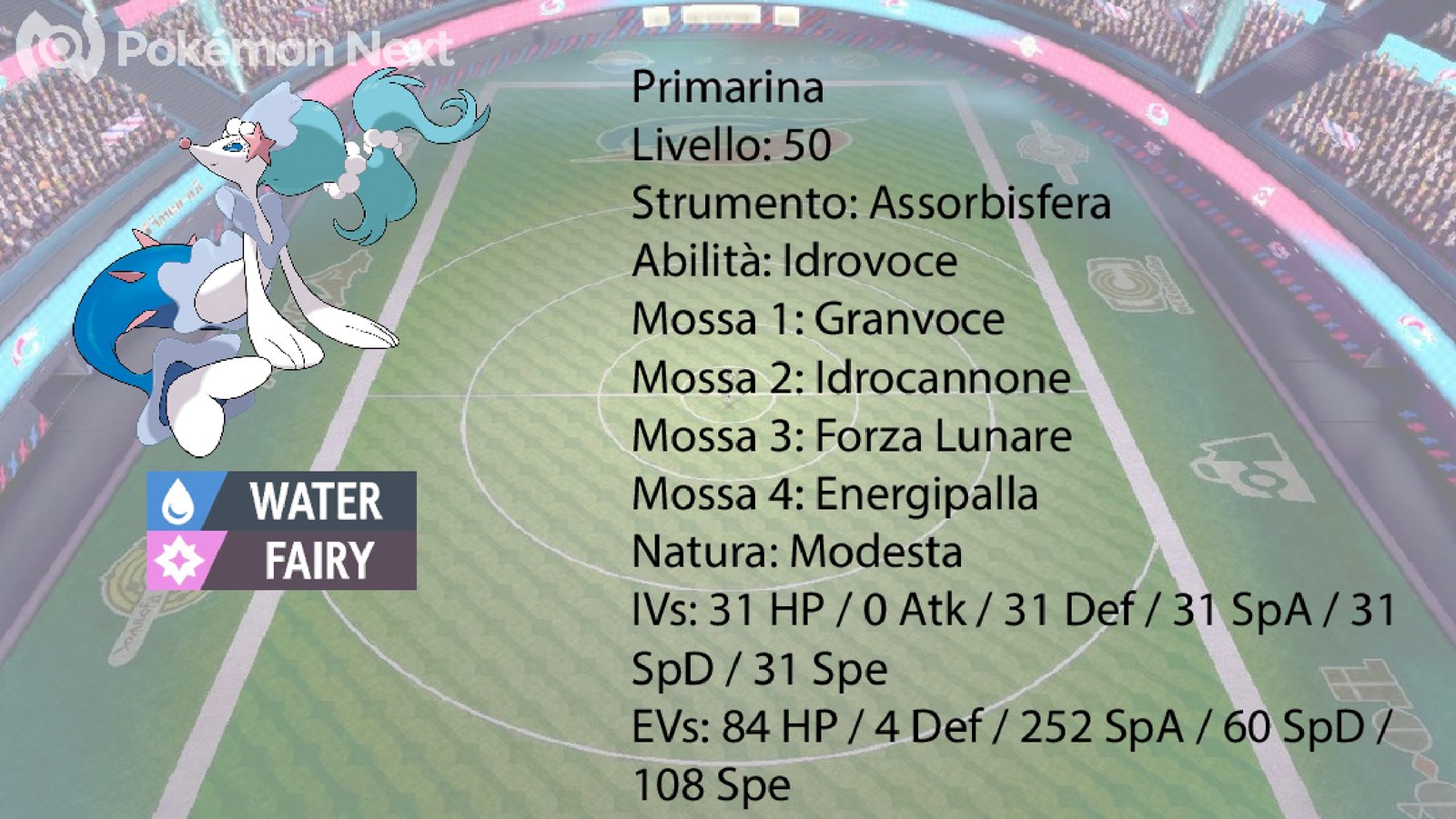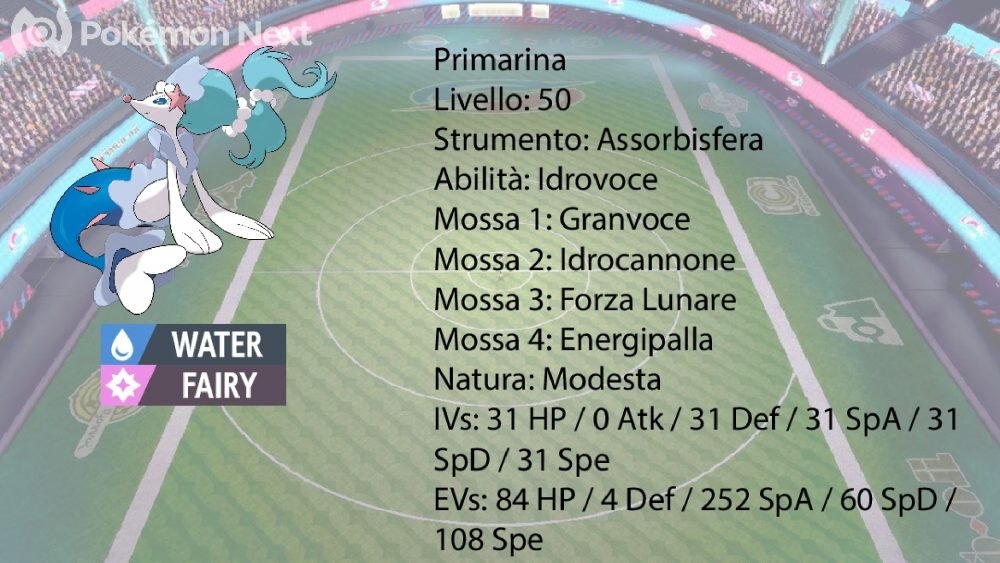 Partiamo dalla stella del Team, ovvero Primarina. Possiede lo strumento Assorbisfera, che aumenta il potenziale offensivo del Pokémon al costo di qualche PS. Oltre a Idrocannone, Forza Lunare ed Energipalla, mossa utile contro Gastrodon, Pokémon che con l’Abilità Acquascolo attira le mosse di tipo Acqua su di se, possiede Granvoce, mossa che diventa di tipo Acqua grazie alla HA Idrovoce. Quando Primarina diventa Dynamax, Granvoce diventa Dynattacco, di tipo Normale, che diminuisce la Velocità dei nemici di 1 stadio. Questo effetto è molto utile contro il pericolo principale di Primarina, ovvero Dracozolt. Primarina, con la sua Spread EV, supera Dracozolt con la Velocità ridutta di 1 stadio. Per il resto, la Spread EV aumenta le capacità offensive e difensive di Primarina.