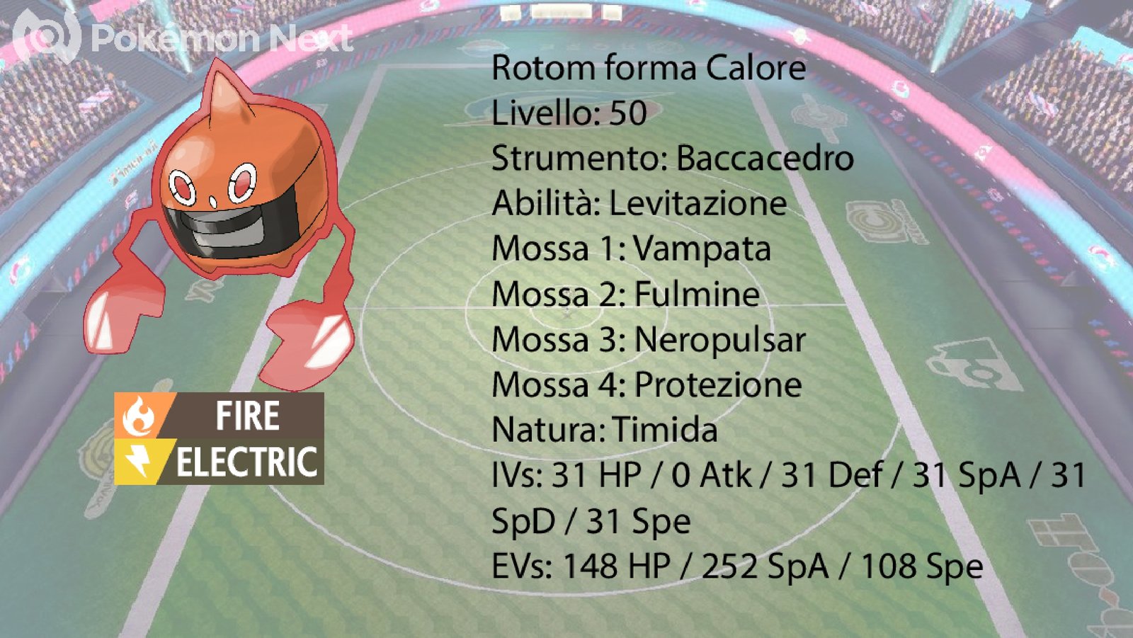 Quinto membro da analizzare è Rotom-H. Come detto in precedenza, il suo ruolo è quello di secondo Sweeper e di seconda Dynamax del Team. Possiede lo strumento Baccacedro, molto utile per recuperare vita in caso di bisogno, e l’Abilità Levitazione, che evita di far subire a Rotom-H mosse di tipo Terra. Le mosse che possiede sono Vampata, Fulmine, Neropulsar, utile soprattutto per calare la Difesa Speciale avversaria quando diventa Dynatenebre, e Protezione. La Spread EV è fatta per renderlo un buon Bulky Special Sweeper.