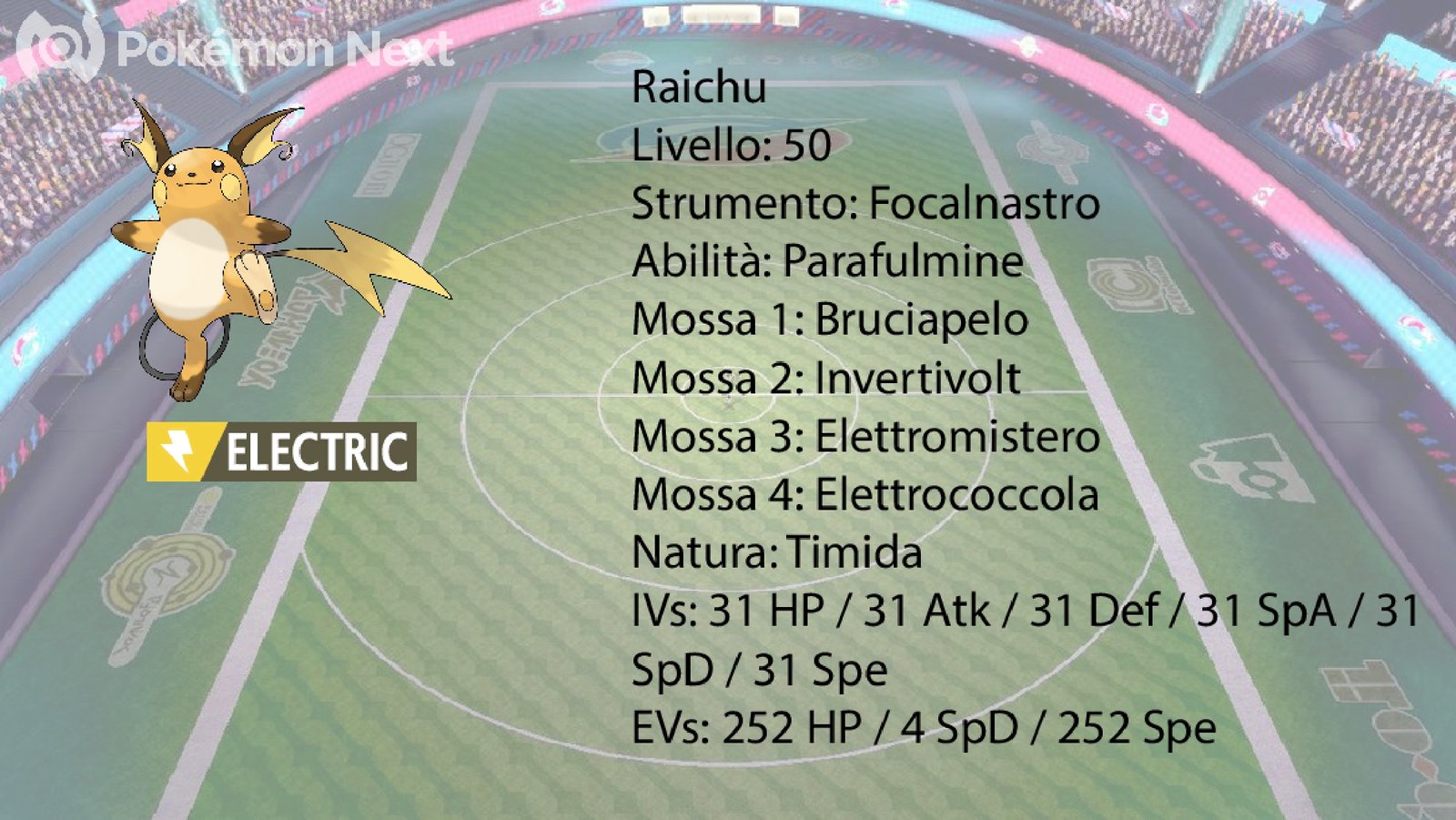Andiamo ad analizzare il secondo membro del Team, ovvero Raichu. Lo strumento Focalnastro gli permette di sopravvivere a svariari attacchi molto potenti, rimanendo con 1 solo PS. La HA Parafulmine gli permette di assorbire gli attacchi elettrici rivolti a Primarina. Le mosse Bruciapelo, Elettromistero, Elettrococcola e Invertivolt gli permettono di far tentennare gli avversari, di paralizzarli e di diminuirgli l’Attacco Speciale di 2 stadi. Nel caso in cui si dovessero trovare delle situazioni in cui Raichu diviene inutile, può essere sostituito immediatamente usando Invertivolt. La Spread EV è quella tipica di un Supporter veloce.