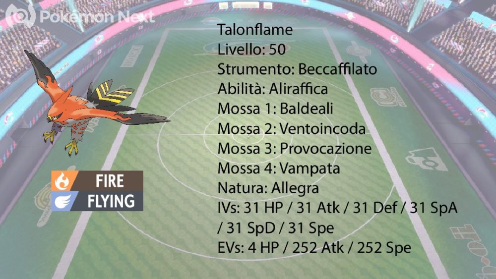 Ultimo Pokémon del Team è Talonflame. Serve principalmente per piazzare Ventoincoda, oltre anche a far danno a Pokémon come Durant. Lo strumento Beccoaffilato aumenta la potenza delle mosse di tipo Volante, che agiscono in priorità grazie alla HA Aliraffica. Oltre a Ventoincoda, possiede anche Provocazione, molto utile per impedire agli avversari di usare mosse di stato. Le mosse Baldeali e Vampata gli permettono di contrastare rispettivamente i Pokémon di tipo Erba e Durant. La Spread EV è quella tipica di un Fast Physical Sweeper.
