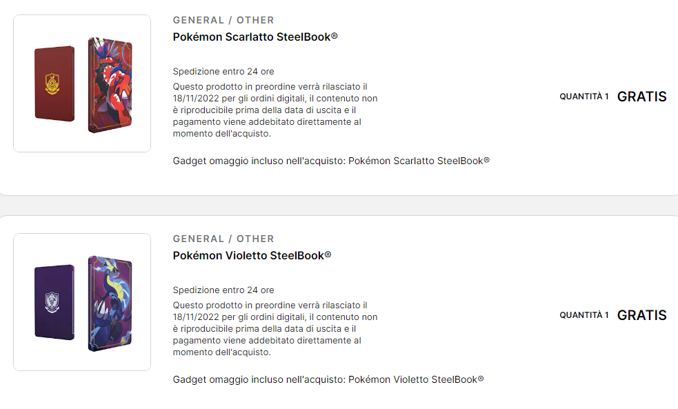 Preordinando la vostra (o le vostre) copie di Pokémon Scarlatto e Violetto sul sito del My Nintendo Store potrete ricevere in omaggio le steelbook dedicati ai due Pokémon leggendari Koraidon e Miraidon.
