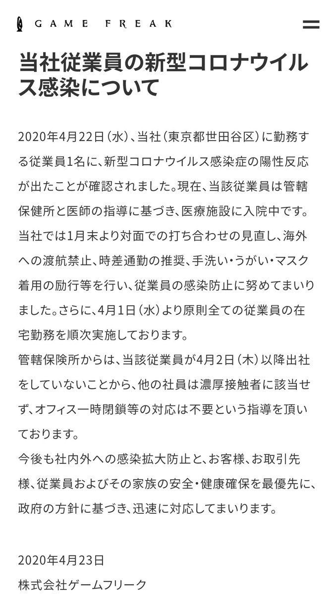 Non si hanno dettagli sul suo stato di salute, ma sembra che il resto dello Staff non corra particolari rischi: Game Freak ha iniziato a seguire le direttive di smart working (lavoro da casa) dal 1° aprile 2020, e la persona in questione non si reca in ufficio dal 2 aprile. Passati quindi più di 15 giorni, pare che gli altri membri siano al sicuro.