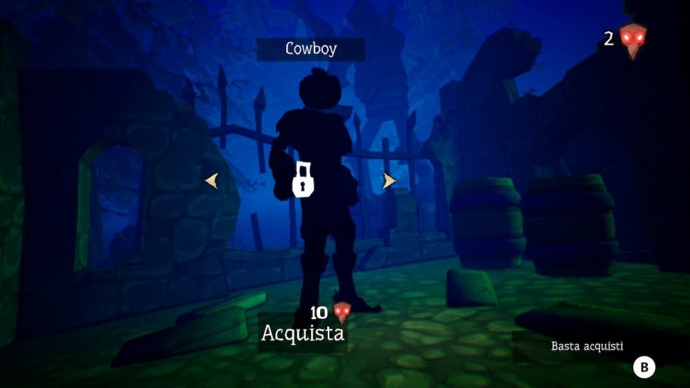Avete capito bene, in una sezione accessibile dal menù, il Campione del Diavolo può essere personalizzato con vari costumi, che potrete acquistare nel negozio (gestito da un buffo venditore!) attraverso delle Teste di Corvo, ovvero i collezionabili che potrete scovare in ogni livello, 20 per ognuno.