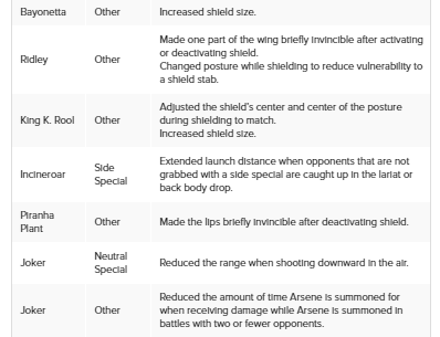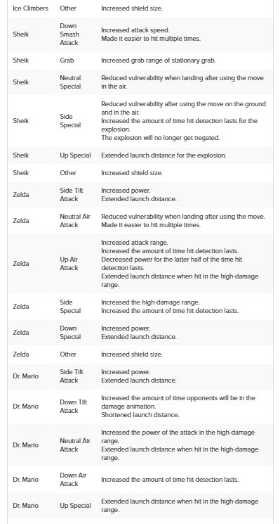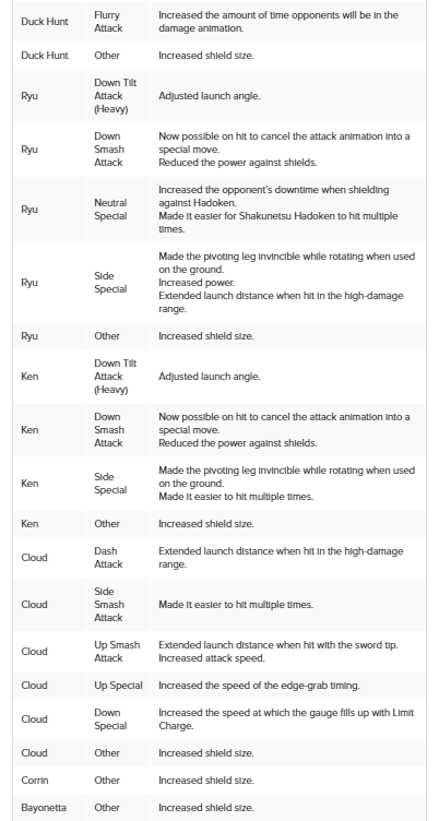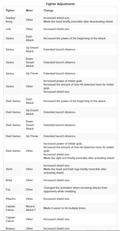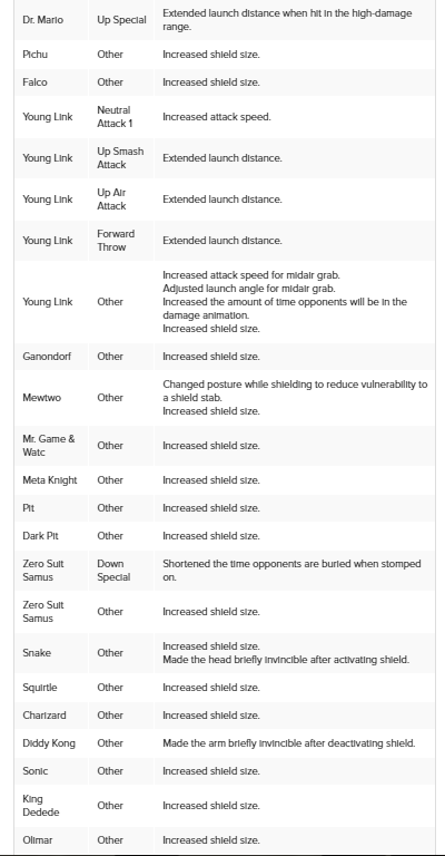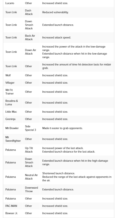 In generale, è stata a quasi tutti i lottatori aumentata la dimensione dello scudo. Oltre ad aggiustamenti vari, molti personaggi hanno visto ingrandita la propria portata di lancio.
