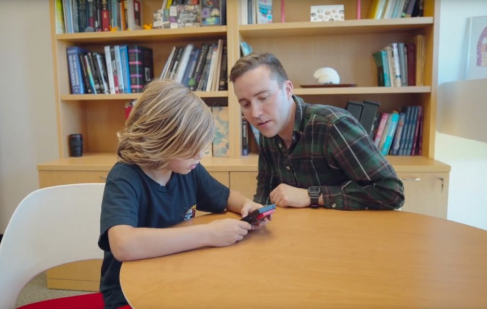 Jesse Gomez con un bambino che gioca a Pokémon un Nintendo Gameboy.