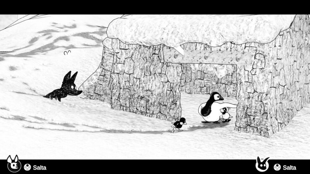 Dopo aver percorso alcune zone però i due si troveranno quasi costretti a collaborare per sopravvivere, poco alla volta, fino a che non si troveranno sulla stessa pianura innevata a seguire le tracce del proprio branco. Da qui inizia il vero gioco collaborativo, accompagnato da un sound design che comprende melodie dolci e malinconiche che guidano i due protagonisti, i versi degli altri animali sopravvissuti alla tempesta o il rumore dei passi sulle diverse superfici.