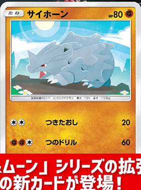 Rhyhorn è di tipo Combattimento, possiede 80 PS e due attacchi: Thrust, che infligge 20 danni e Horn Drill, che ne infligge 60.