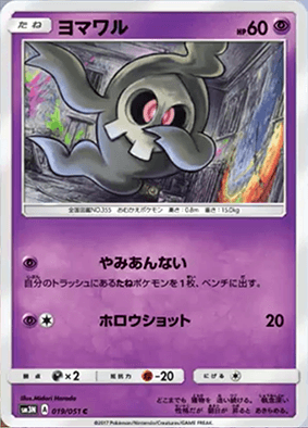 Duskull è di tipo Psiche, possiede 60 PS e due attacchi: Dark Guide, che consiste nel mettere un Pokémon Base nella propria Panchina dopo averlo pescato dalla propria pila degli scarti e Hollow Shout, che infligge 20 danni al Pokémon attivo avversario.