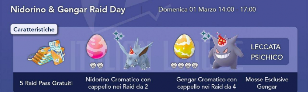 L’evento, programmato Domenica 1 Marzo dalle 14 alle 17, consisteva nella apparizione di Nidorino (anche cromatico) con cappello nei Raid da 2 e di Gengar (anche cromatico) con cappello nei Raid da 4 e 5 biglietti Raid gratuiti.
