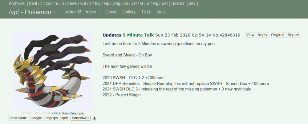 Pokémon Spada e Scudo ha qualcosa ancora in serbo per noi Allenatori? Sì, secondo il post anonimo di questo utente di 4chan. Prima di tutto, dobbiamo tornare indietro nel tempo: era il 23 febbraio 2020, e nel post di quell’utente anonimo ci sarebbero state le previsioni sui titoli di Game Freak in uscita per il 2020, fino al 2022.