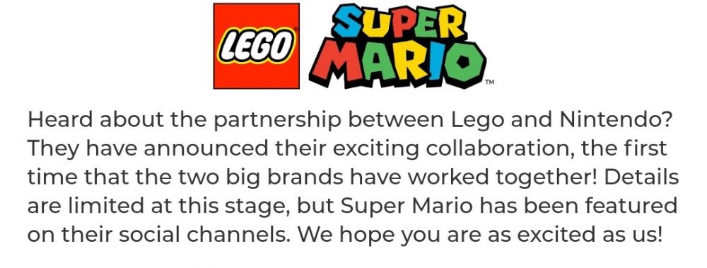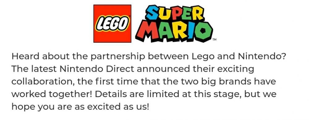 “Avete sentito della partnership tra Lego e Nintendo? L’ultimo Nintendo Direct ha annunciato una loro fantastica collaborazione, la prima volta che questi due grandi brand lavorano insieme! Non ci sono molti dettagli al momento, ma speriamo che siate emozionanti come noi!”