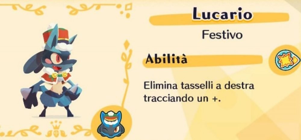 Soddisfando le richieste di Lucario si aumenterà il livello di amicizia con lui, per poi infine poterlo reclutare nel proprio staff. Una volta ottenuto il Pokémon, la sua abilità sarà: eliminare i tasselli a destra tracciando un +.