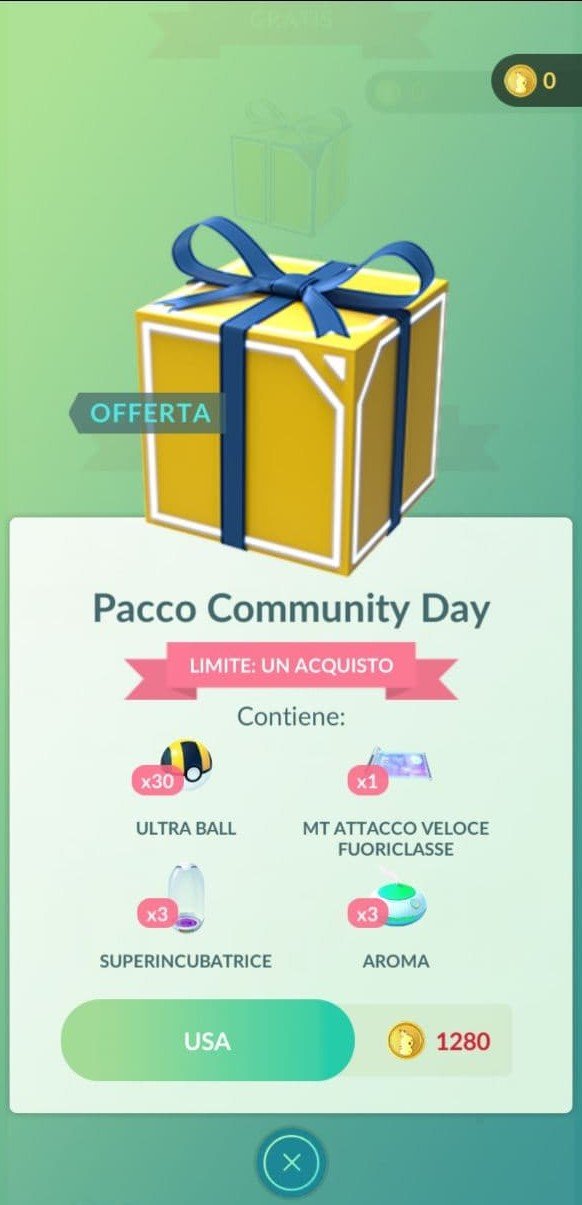 Vi ricordiamo che è disponibile nel Negozio il Pacco Community Day: al prezzo di 1280 Pokémonete otterrete Ultra Ball x30, Superincubatrice x3, MT attacco caricato fuoriclasse x1 e Fortunuovo x3!