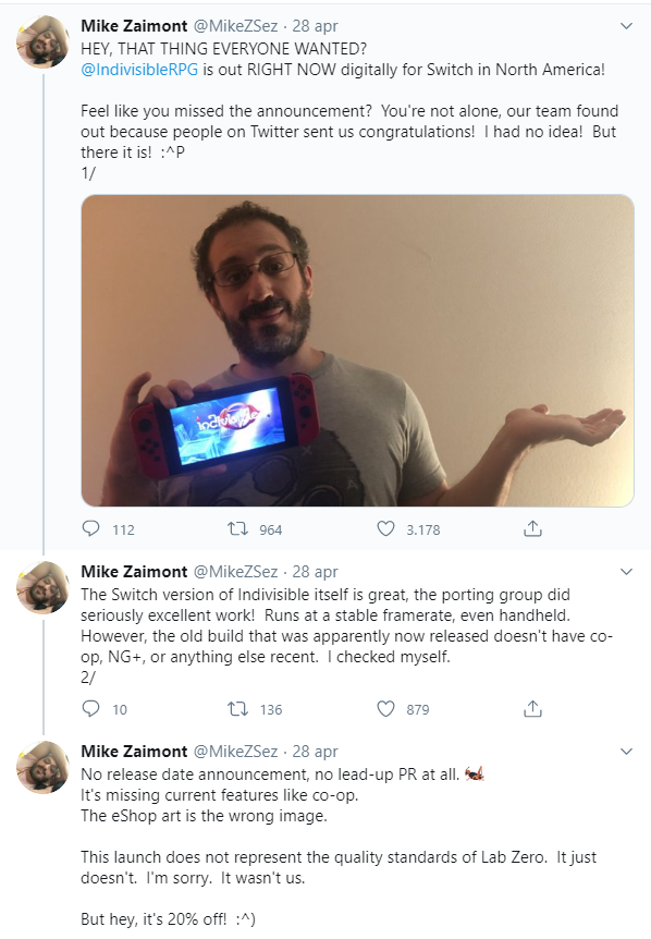 Per prima cosa, possiamo confermare che, effettivamente, nel weekend, Nintendo ha ritirato il gioco dal Nintendo eShop di ogni regione, ove disponibile. La situazione in atto, spinse molti utenti a domandare direttamente, su Twitter, a Nintendo of America lumi sulla vicenda. Ciò si era reso necessario, considerando la presenza di comunicazioni discordanti, a volte contradditorie, ma nessuna di esse provenienti da fonti ufficiali.