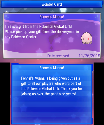 Ecco però che il PGL vuole donarci un Pokémon come “regalo d’addio”. Infatti i giocatori di Pokémon Sole e Luna e di Pokémon Ultrasole e Ultraluna, che effettueranno un accesso al PGL entro il 24 febbraio 2020, riceveranno Munna, il Pokémon Divorasogni.