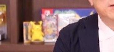 Tsunekazu Ishihara nel Pokémon Present di oggi, con degli scaffali riempiti di gadget Pokémon dietro di se. La presenza di Pokèmon di Johto si nota con facilità.