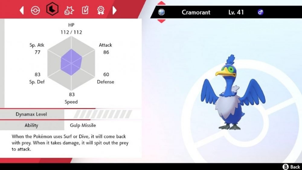 Arriviamo al Pokémon Ghiottone Cramorant che con la sua abilità inghiottimissile lo rende un Pokémon molto valido. Notiamo dalla foto che il Pokémon punterà soprattuto sui PS, con un buon attacco fisico ed una discreta velocità.
