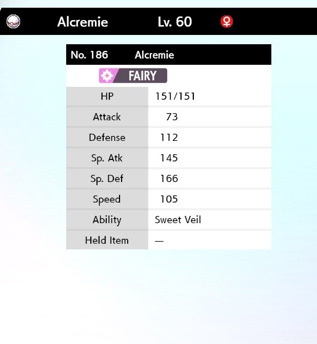 Probabilmente il PokémonpannafrescaAlcremie avrà un ruolo preponderante come Pokèmon supporto. La sua abilità Dolcevelo (che non permette ai Pokémon alleati di addormentarsi) e la sua mossa esclusiva capace di potenziare di molto l’attacco fisico e speciale di un Pokémon alleato, lo renderanno un compagno abile nelle lotte in doppio. Inoltre, dalle statistiche possiamo notare una elevata difesa speciale ed un attacco speciale di tutto rispetto. Ricordiamo inoltre che Alcremie avrà anche una forma Gigamax.