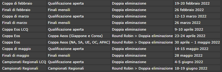 Ci sono sette zone regionali per il gioco e i giocatori guadagneranno CP per tutto il tempo a partire da questo mese. Le zone sono: Nord America, Sud America, Europa, Oceania, Giappone, Corea del Sud e Asia-Pacifico. Ci saranno finali mensili, Aeos Cups con finali e campionati regionali in cui le prime 8 squadre di ogni zona guadagneranno un posto. A loro si uniranno le prime 4 squadre del mese precedente.