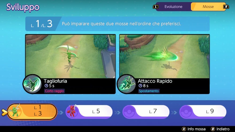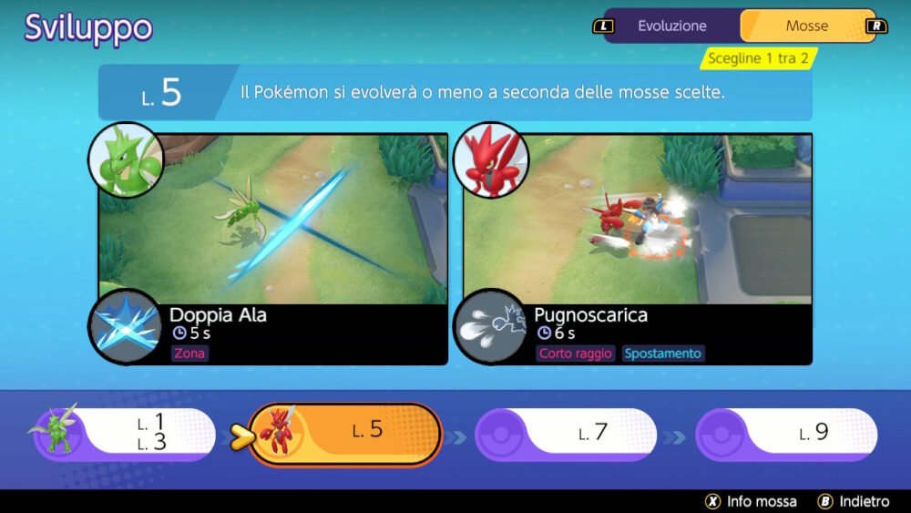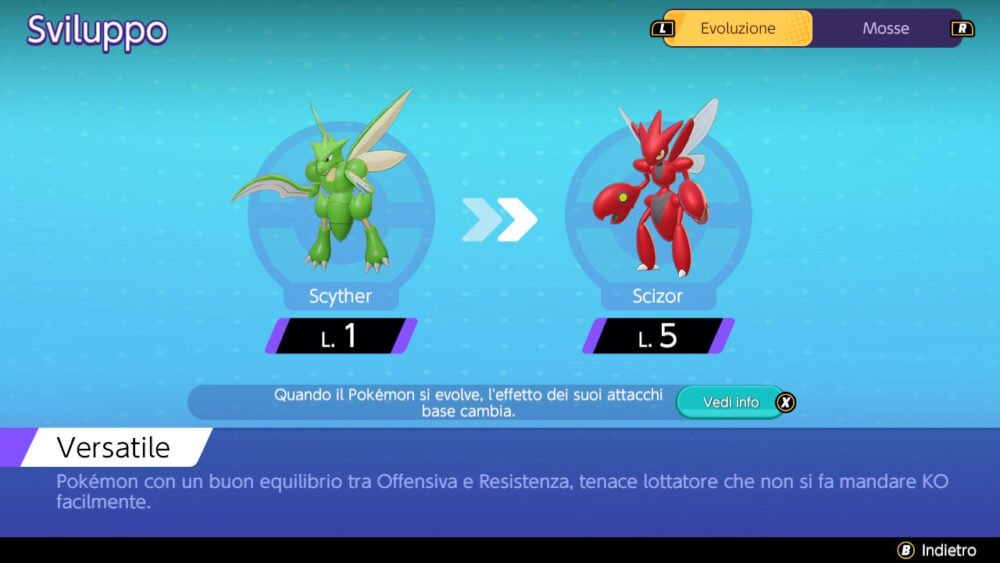 Scizor ha una meccanica unica in questo gioco che permette al giocatore di scegliere se evolvere o meno il Pokémon per tutta la partita. La scelta la si potrà fare scegliendo una mossa o l’altra al livello 5. Sia Scizor che Scyther hanno meccaniche distinte che possono alterare drasticamente il loro contributo alla composizione della squadra.
