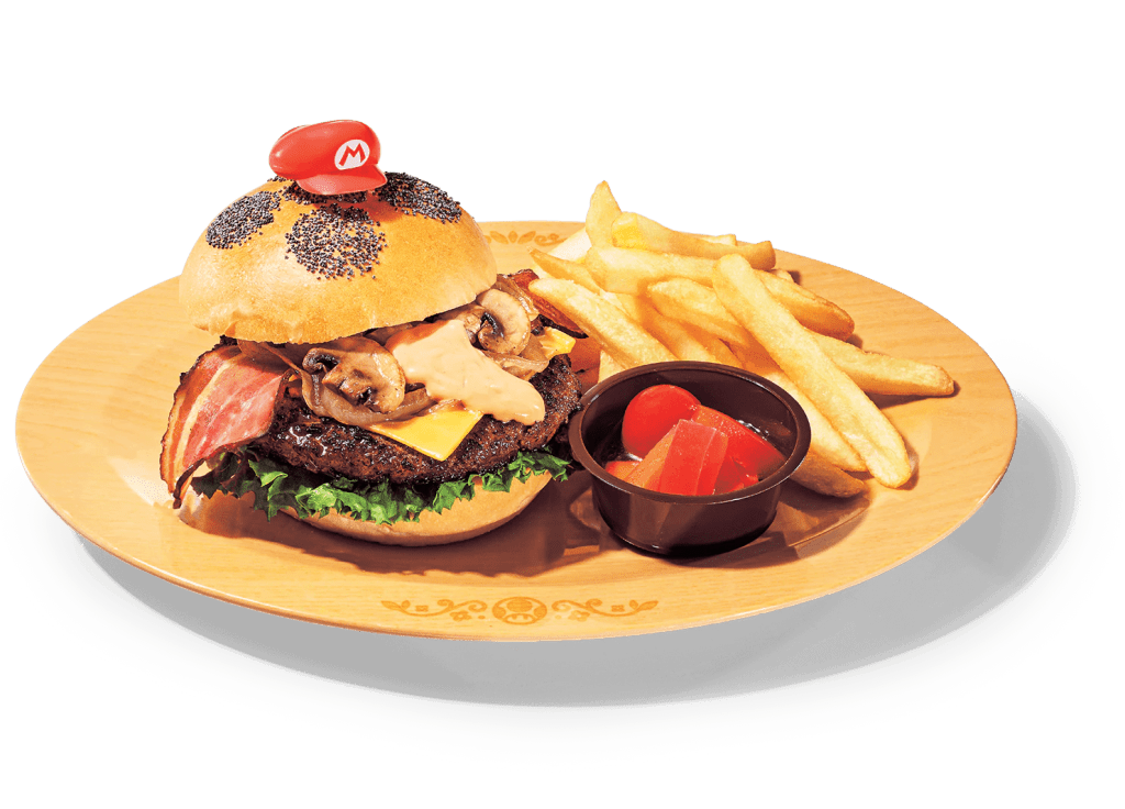 Mario’s Bacon Cheeseburger: Creato proprio per Mario! Questo panino contiene un hamburger accompagnato da funghi e pecorino. Sopra il panino, troverai un plettro a forma di cappello di Mario.