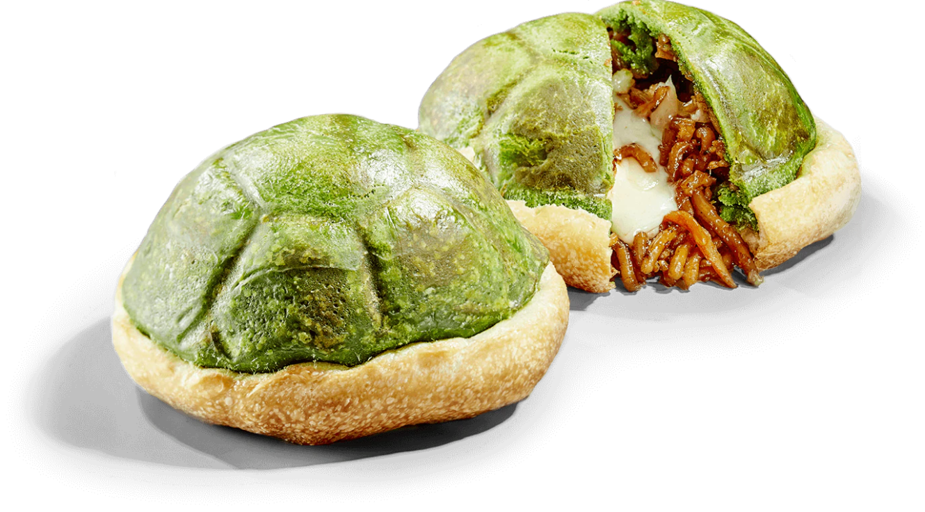 Calzone a forma di guscio verde ripieno di yakisoba e formaggio: Mordi un Calzone Koopa! All’interno della crosta troverai un gustoso ripieno di yakisoba e formaggio!