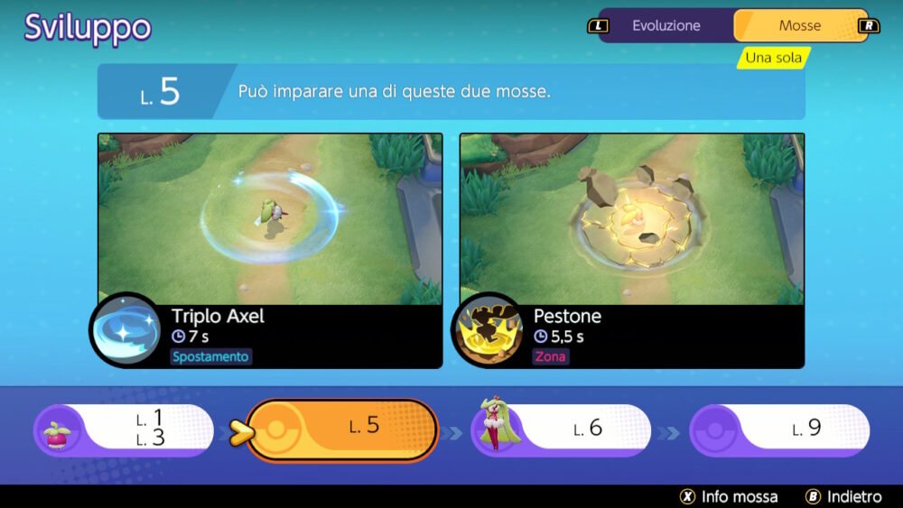 - Triplo Axel (Triple Axel): chi la usa sferra tre calci rotanti consecutivi nella direzione indicata, infliggendo danni ai Pokémon avversari. I danni inflitti aumentano con ciascun calcio che va a segno. Dopo aver utilizzato questa mossa, la velocità dei suoi attacchi base aumenta per un po’ in misura proporzionale al numero di calci che hanno colpito l’avversario. Se viene utilizzata da Tsareena, grazie all’abilità Regalità attiva, recupera un po’ di Punti Salute con ogni calcio andato a segno. Al livello 10 aumenta il danno inflitto dalla mossa. Tempo di ricarica: 7 secondi.