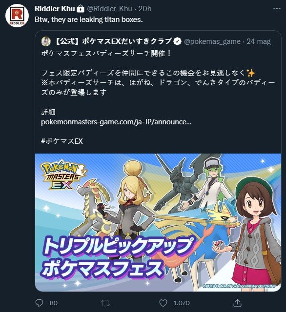 Durante le ultime ore, Khu ha affermato che anche gli account ufficiali Pokémon stanno giocando al “gioco dei leak”, condividendo sul suo profilo Twitter un annuncio di Pokémon Masters EX con in copertina Gloria con Zacian, N con Zekrom e Camilla con Kommo-o, sottolineando che quest’immagine è collegabile ai Pokémon leggendari di Scarlatto e Violetto.