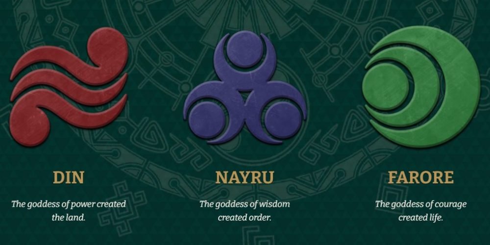 Prima che il tempo iniziasse a scorrere, le tre Dee discesero nella primordiale e caotica landa di Hyrule, che ancora non portava questo nome. Din, la Dea del Potere, creò la terra. Nayru, la Dea della Saggezza, conferì l’ordine al mondo. Farore, la Dea del Coraggio, creò la vita.